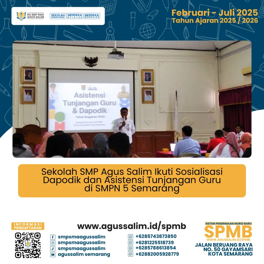 Pada Rabu, 14 Mei 2025, operator sekolah SMP Agus Salim mengikuti kegiatan undangan kedinasan yang berlangsung di SMP Negeri 5 Semarang. Kegiatan ini dimulai pukul 08.00 WIB dan berlangsung hingga selesai, dengan tujuan memberikan sosialisasi dan asistensi terkait pengelolaan Data Pokok Pendidikan (Dapodik) serta mekanisme tunjangan bagi guru negeri dan swasta pada jenjang Sekolah Menengah Pertama (SMP).